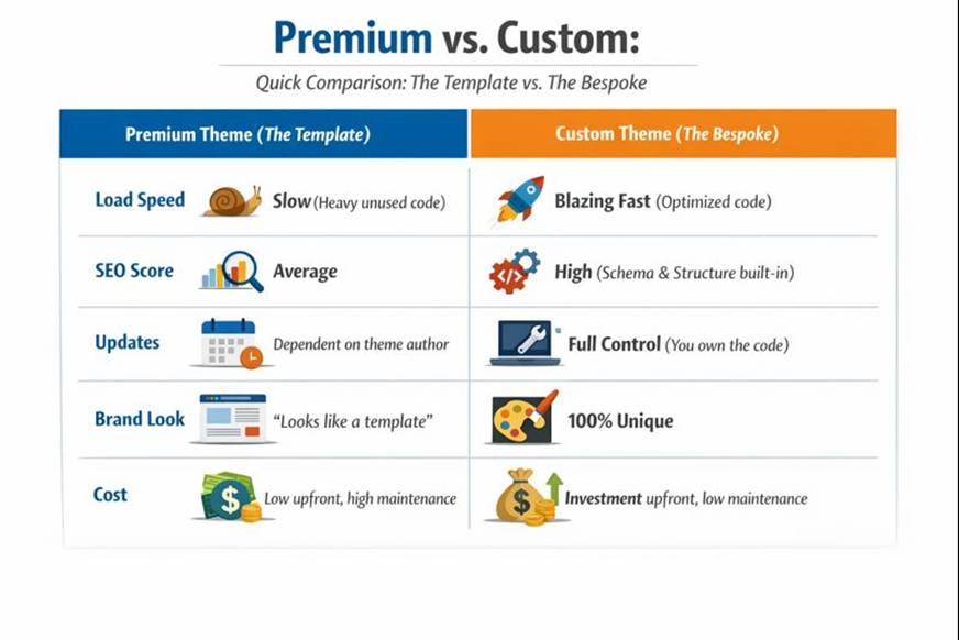 Google’s Core Web Vitals are now a mature ranking factor. A pre-made theme often comes with 50 different font styles, 10 sliders, and 4 page builders packed into one zip file. You might use only 5% of those features, but your user’s browser has to load 100% of the code.
